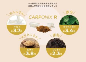 収穫された高麗人参を「蒸す+乾燥」を9回繰り返し黒参化させ、粉末状にしています。高麗人参の粉末100%でできており、添加物は不使用(内容物に限る)です。この高麗人参を国内にて「蒸す+乾燥」を9回繰り返し凝縮する黒参化を行い、砕いて固めた黒高麗人参が「カルポニクス」です。